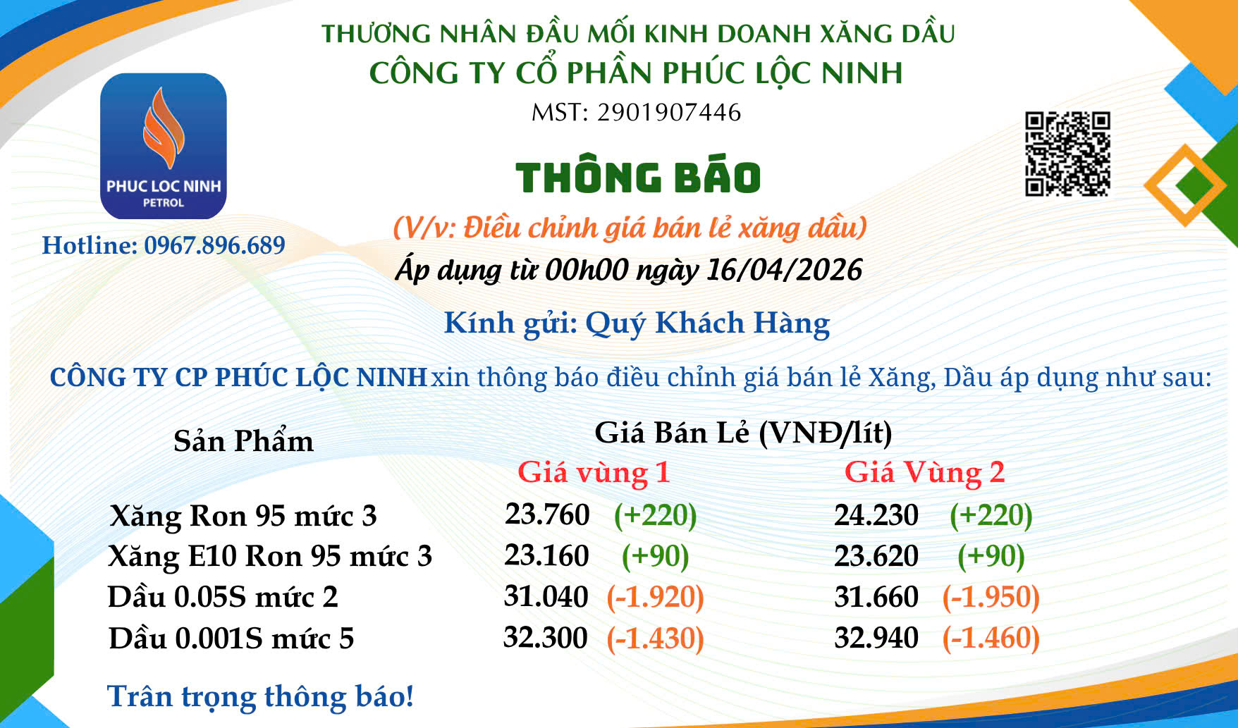 PhuclocninhPetrol Điều chỉnh giá xăng dầu từ 22 giờ 00 phút ngày 12.03.2026