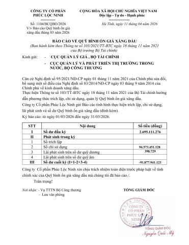 Báo cáo định kỳ Quỹ bình ổn giá xăng dầu (BOG) – tháng 03/2026