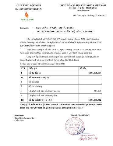Báo cáo định kỳ Quỹ bình ổn giá xăng dầu (BOG) – tháng 06/2025