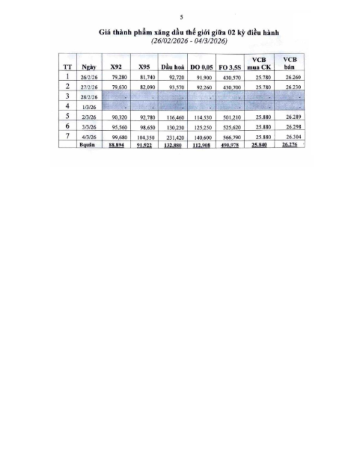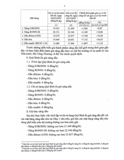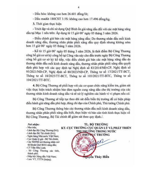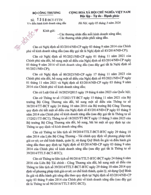 Văn bản số 1358/BCT-TTTN ngày 05.03.2026 về điều hành kinh doanh xăng dầu