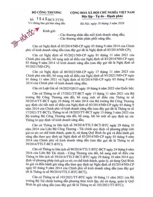 Văn bản số 1545/BCT-TTTN ngày 10.03.2026 về điều hành kinh doanh xăng dầu