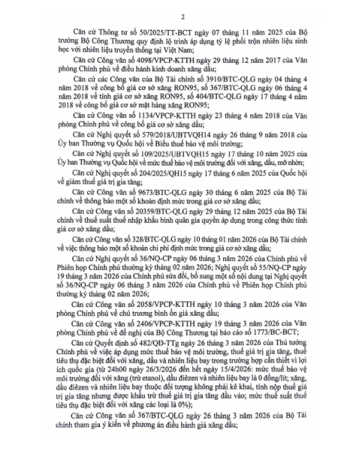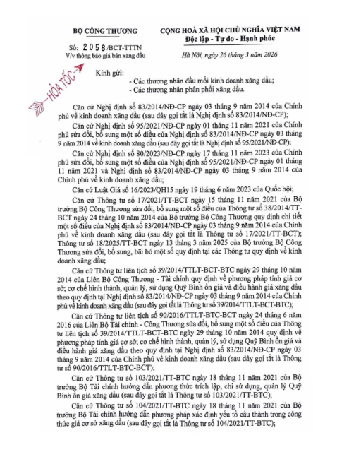 Văn bản số 2058/BCT-TTTN ngày 26.03.2026 về điều hành kinh doanh xăng dầu