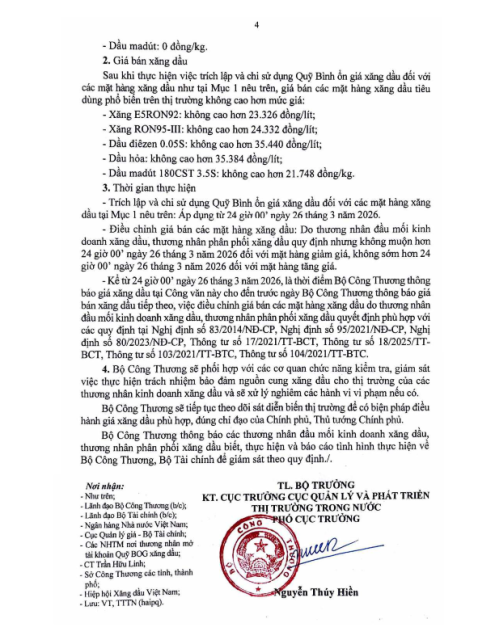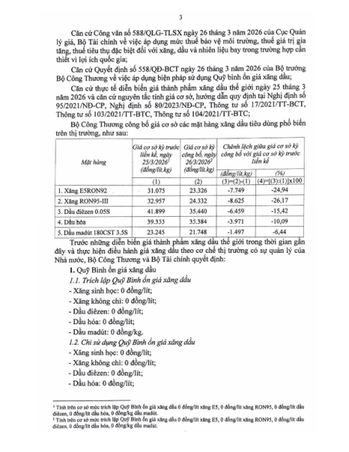 PhuclocninhPetrol Điều chỉnh giá xăng dầu từ 24 giờ 00 phút ngày 26.03.2026