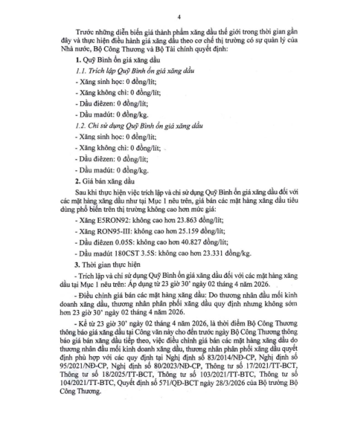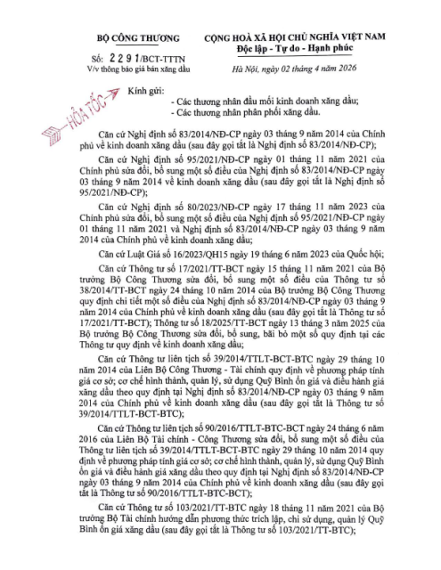 Văn bản số 2291/BCT-TTTN ngày 02.04.2026 về điều hành kinh doanh xăng dầu