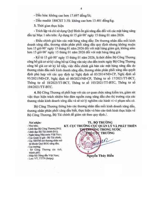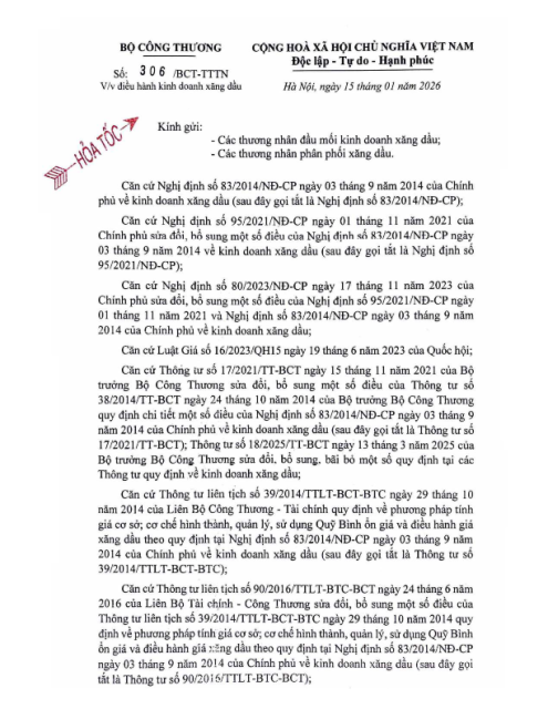 Văn bản số 306/BCT-TTTN ngày 15.01.2026 về điều hành kinh doanh xăng dầu
