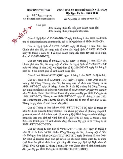 Văn bản số 7823/BCT-TTTN ngày 09.10.2025 về điều hành kinh doanh xăng dầu