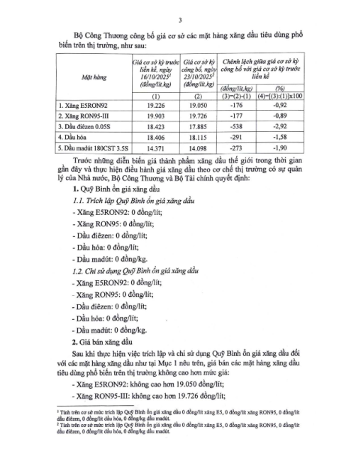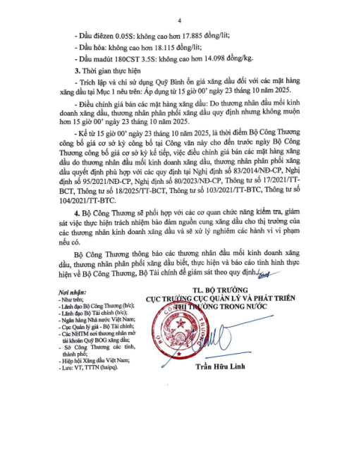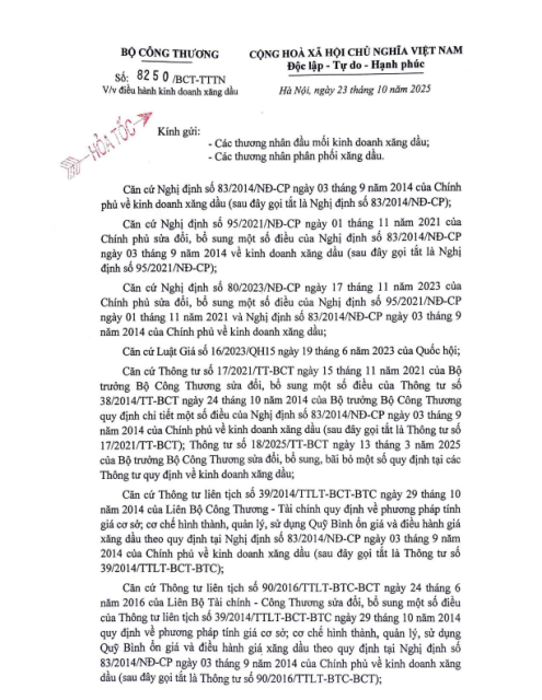 Văn bản số 8250/BCT-TTTN ngày 23.10.2025 về điều hành kinh doanh xăng dầu