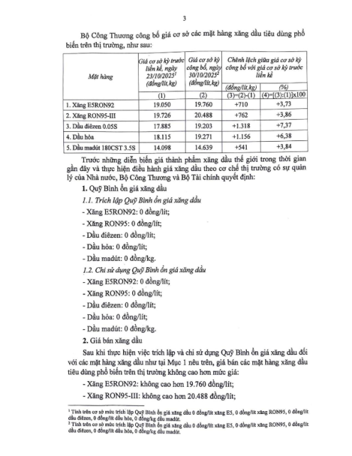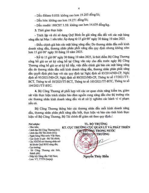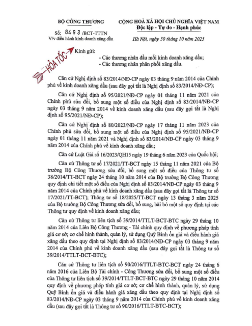 Văn bản số 8493/BCT-TTTN ngày 30.10.2025 về điều hành kinh doanh xăng dầu