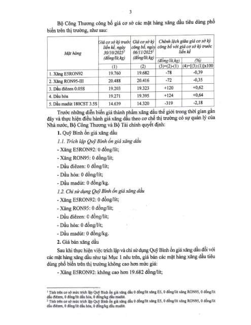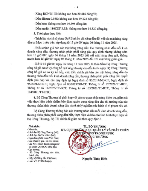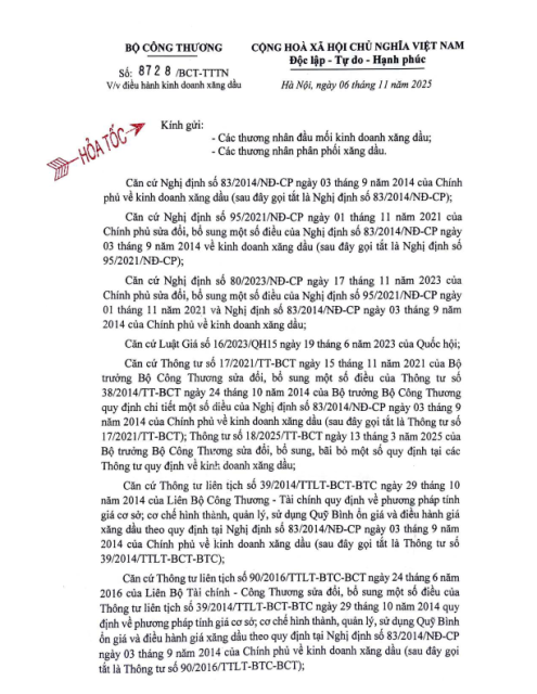 Văn bản số 8728/BCT-TTTN ngày 06.11.2025 về điều hành kinh doanh xăng dầu