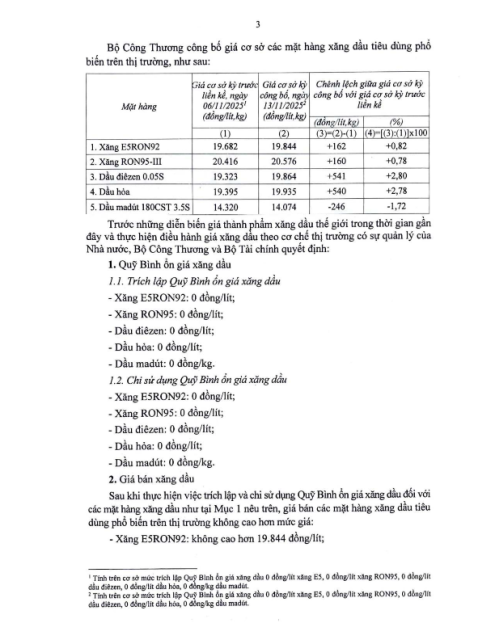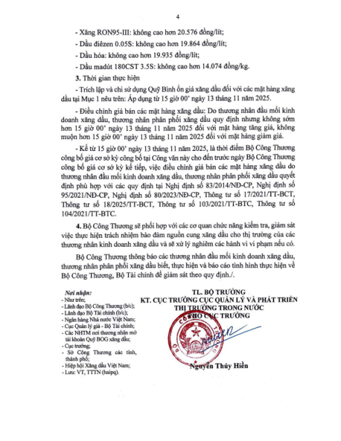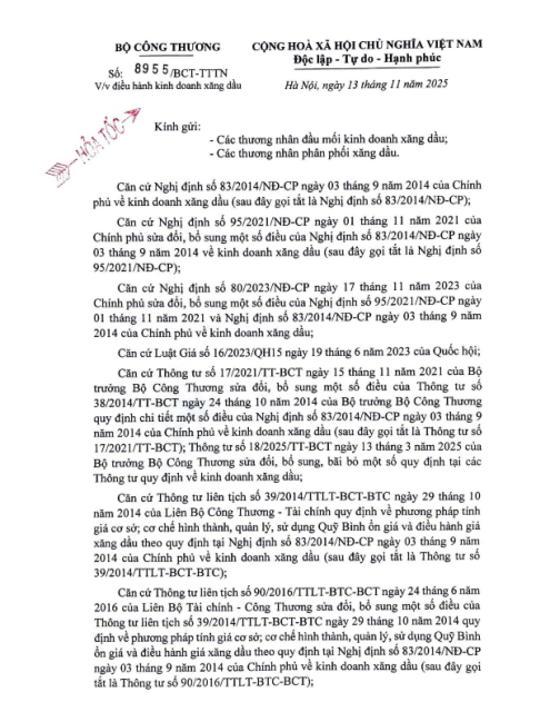 Văn bản số 8955/BCT-TTTN ngày 13.11.2025 về điều hành kinh doanh xăng dầu