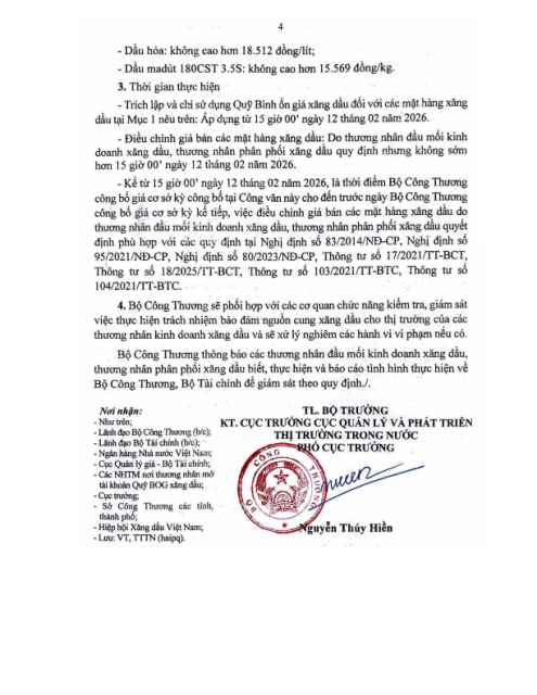 Văn bản số 971/BCT-TTTN ngày 12.02.2026 về điều hành kinh doanh xăng dầu